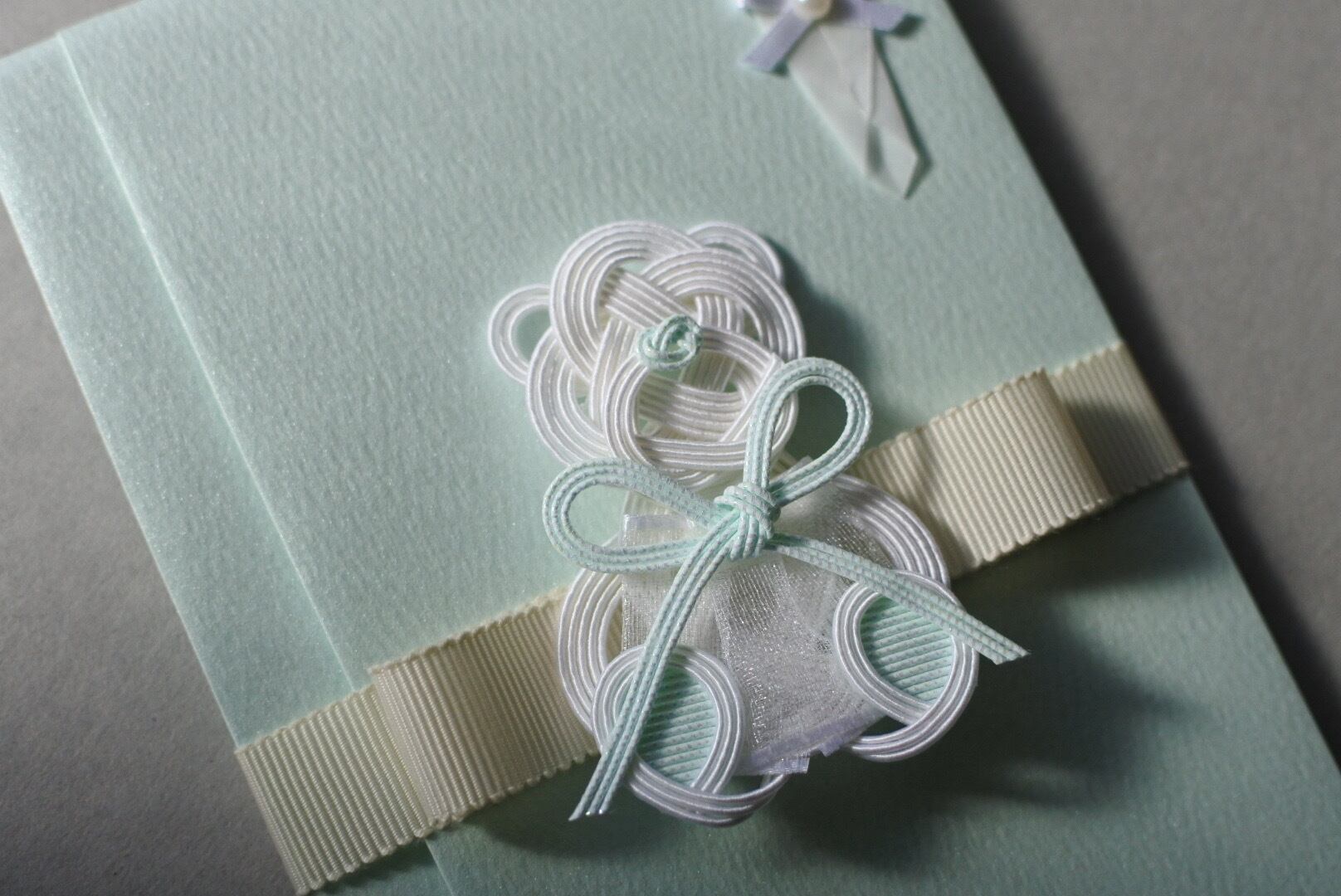 健やかな成長を祈り、ファーストベアのようにそばで見守っていますという想いをこめて水引でかわいらしいテディベアを結びました