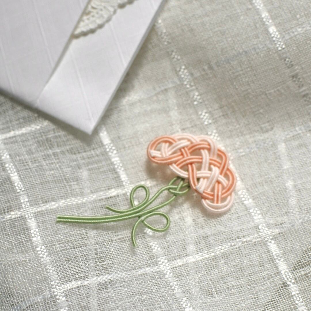フリル状の花びらにあたたかい光があたっている様子を2色の水引で結びました♩