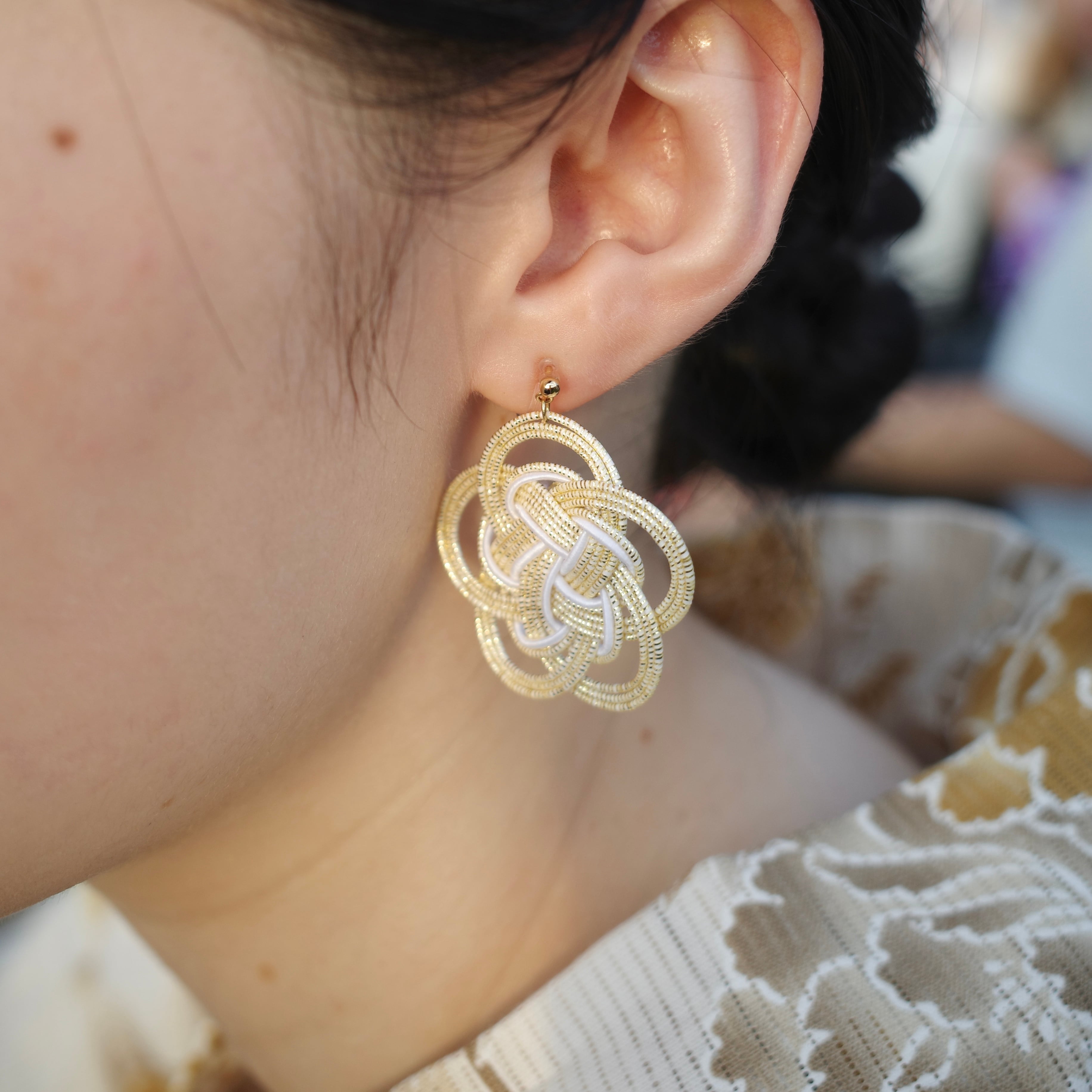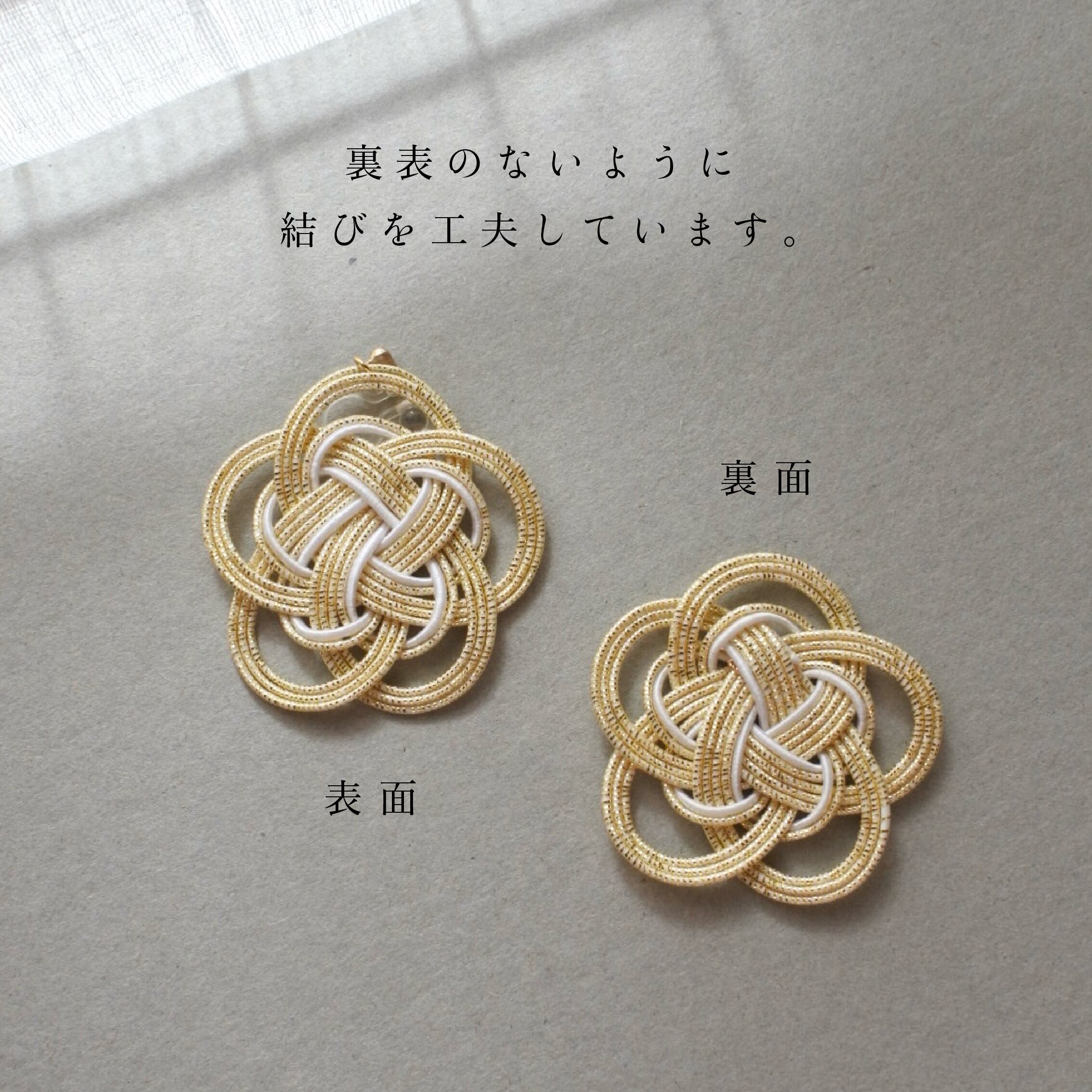 伝統的な梅結びでは、構造上どうしても裏側にワイヤーなどの処理が見えることがありますが、このアクセサリーでは、裏面に当たる部分にも“ひとつの花”としての美しさを感じていただけるように結びを工夫した、独自の仕立てで結んでいます◎
