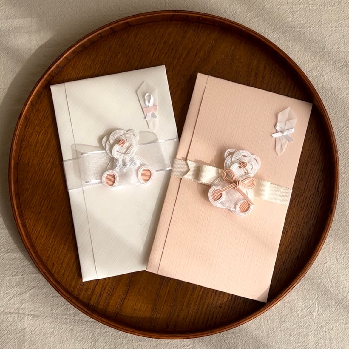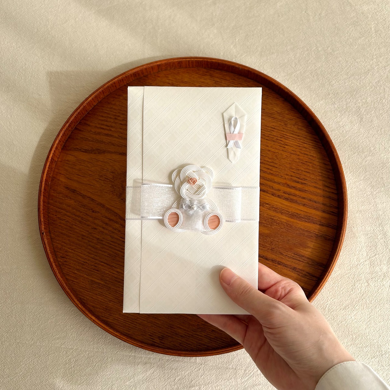 お色はご結婚のお祝いでよくお選びいただく白色を基調に、やさしいピンク色を合わせたかわいらしい印象のご祝儀袋です◎