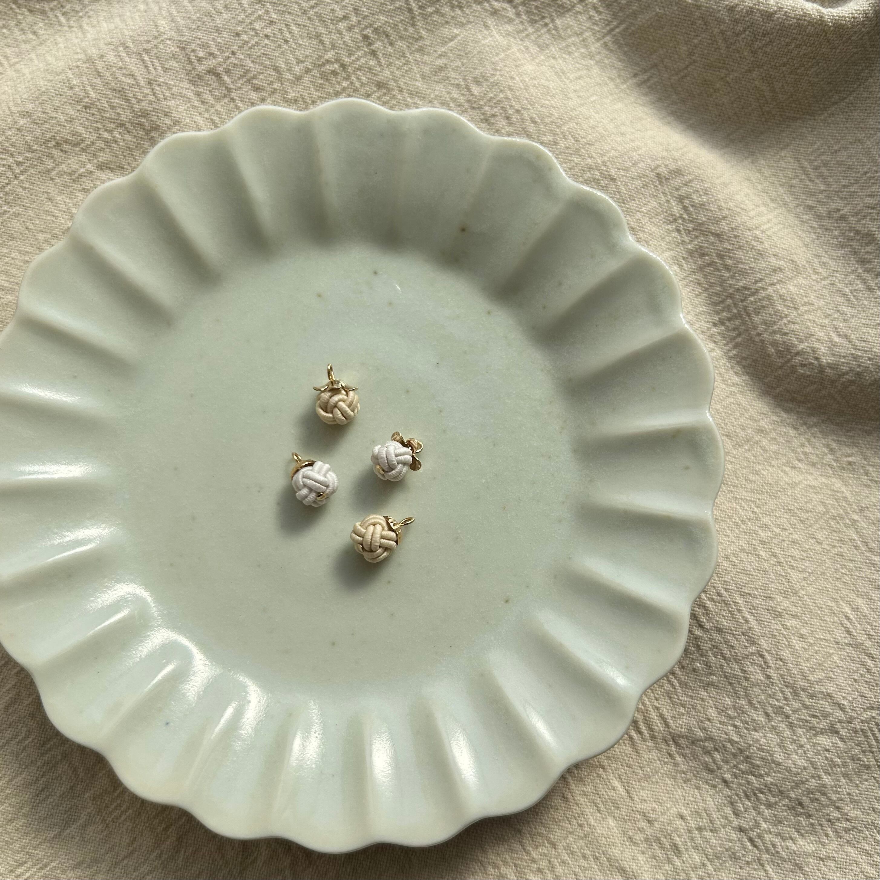 水引で結んだ“あわじ玉”に、チューリップハットのようにツバがフリルになっている帽子を被せると、まるで木の実のようなころんとかわいらしい小ぶりなアクセサリーが出来上がりました♩