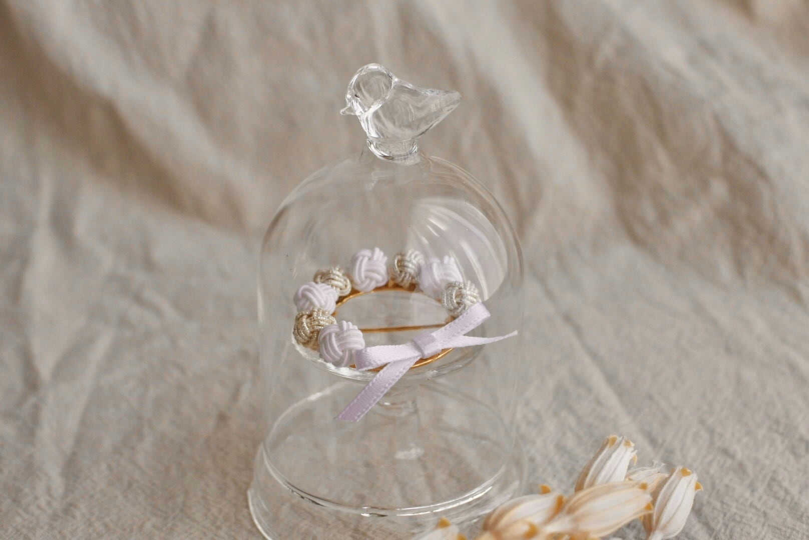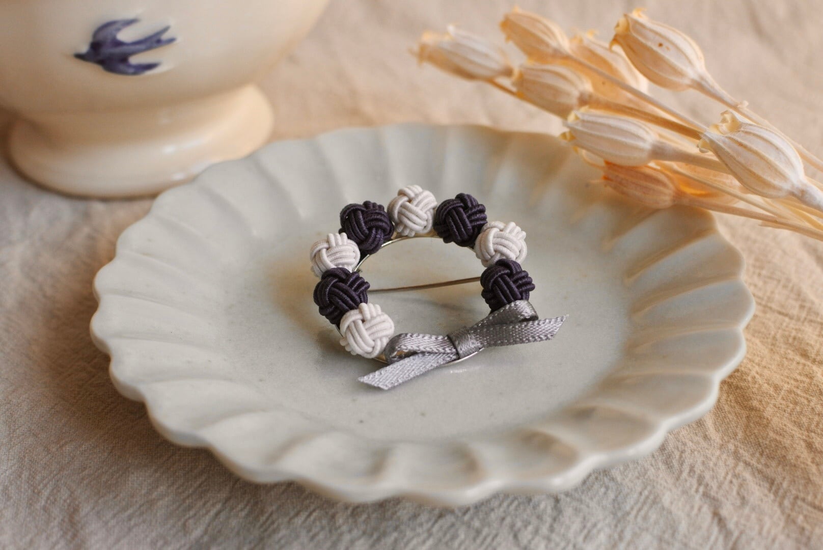 上質な飯田水引を使用し、ひとつひとつ人の手で丁寧に結ばれた玉結びで、かわいらしくも上品なリングブローチを作りました♩