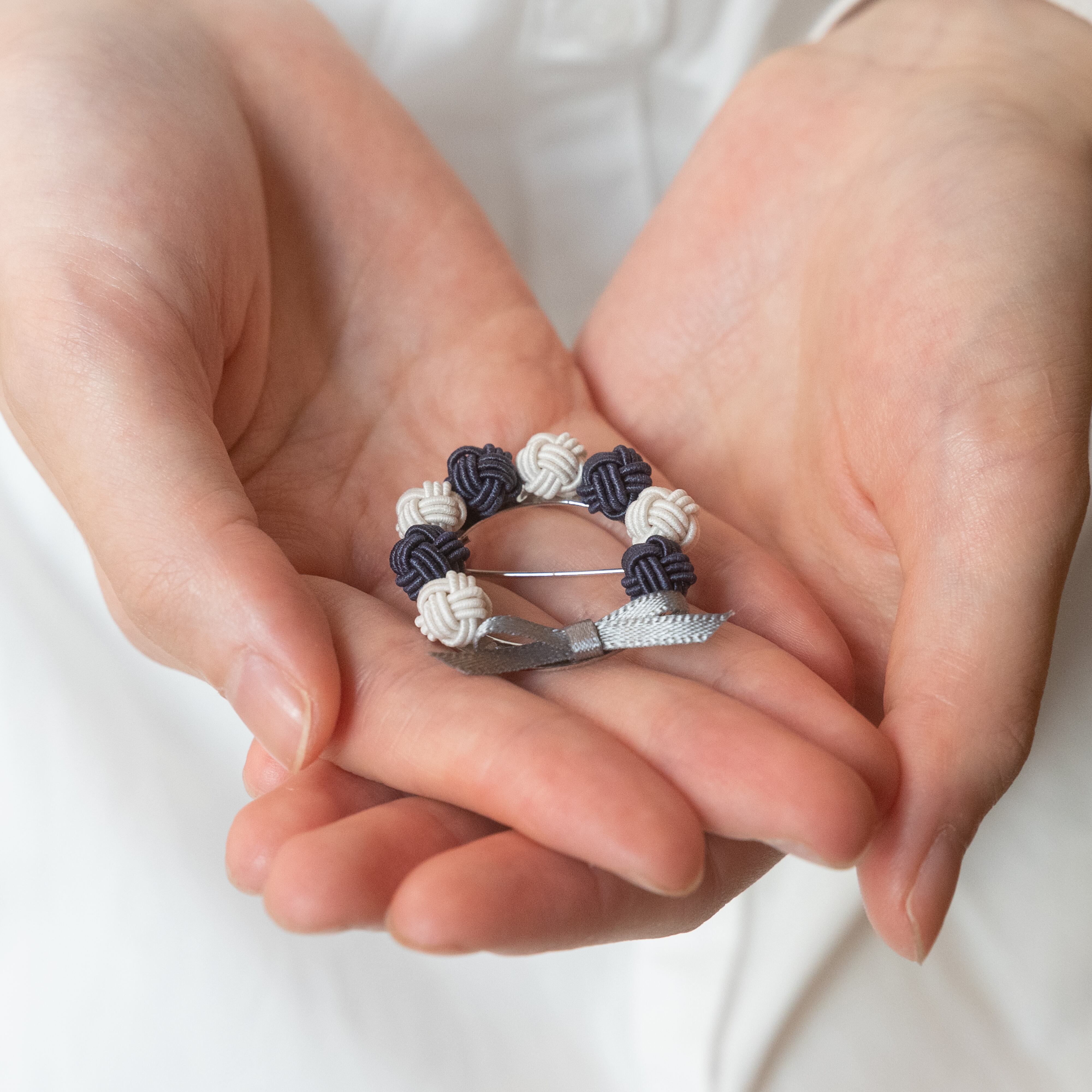 上質な飯田水引を使用し、ひとつひとつ人の手で丁寧に結ばれた玉結びで、かわいらしくも上品なリングブローチを作りました♩